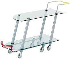 Sleek, happy-looking glass & lacquered steel rolling bar & serving cart by the most iconic Spanish designer of the 1980's Javier Mariscal!! He designed the mascot/logo Gobi for the Barcelona Olympics in 1992, including the colorful, Miro-esque Olympic logo. His nightclubs, hotels, restaurants & other furniture objects always possessed a great sense of verve & wit - this HILTON cart looks as though it could get a ticket for speeding even while it is standing still!