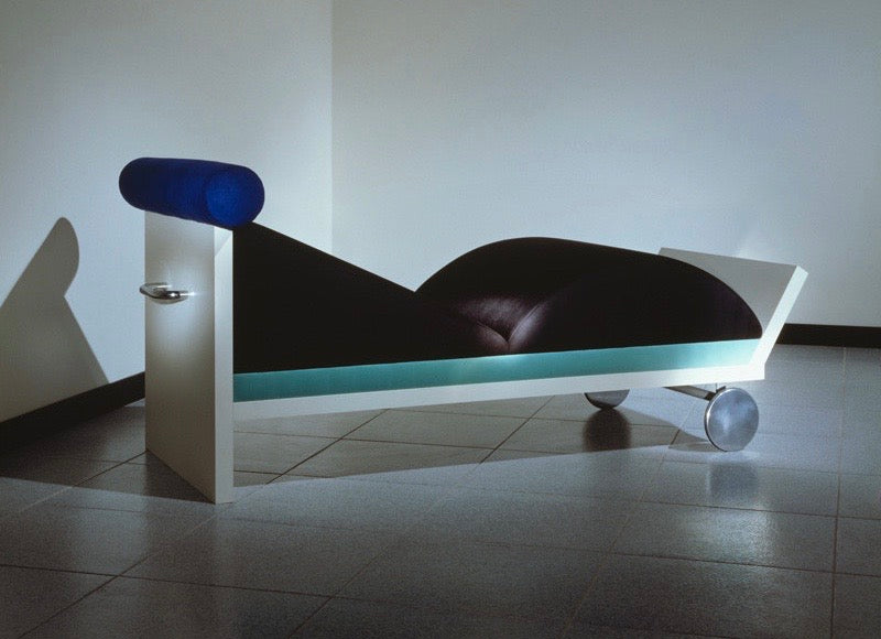 A beautiful, serene MEMPHIS chaise lounge in solid wood covered in ABET plastic laminate, hand-milled metal wheels & handle at its head for gripping & pulling to & fro. Upholstered in dark gray & cobalt blue Alcantara (Ultrasuede). One of the final mature objects that Aldo Cibic designed for MEMPHIS srl (he was one of the inceptors of the movement), there exists only a very small handful of "Juan" settees in existence (3-4 units only --- VERY VERY RARE!). Incredibly comfortable to lay upon, you can imagine having a vast array of PostModern dreams whilst slumbering there!!