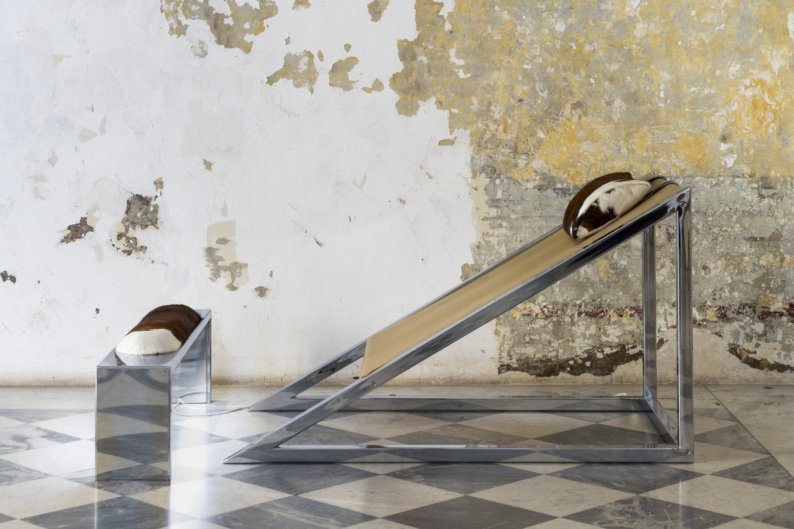 This chair/footrest combo was a wedding present to one member of the Archizoom Group from the other members. This iconic chair not only plays with the levant minimalism of Mies van der Rohe, but has come to represent 1960s-1970s, Italian Radical Design.