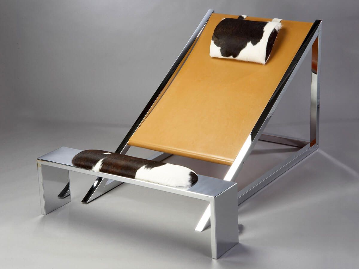 Chromed steel frame, a seat in elastic latex that forms to the weight of the body, headrest in pony-skin leather, a lighted footrest.
