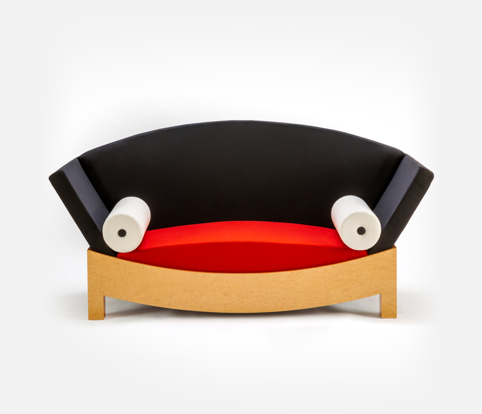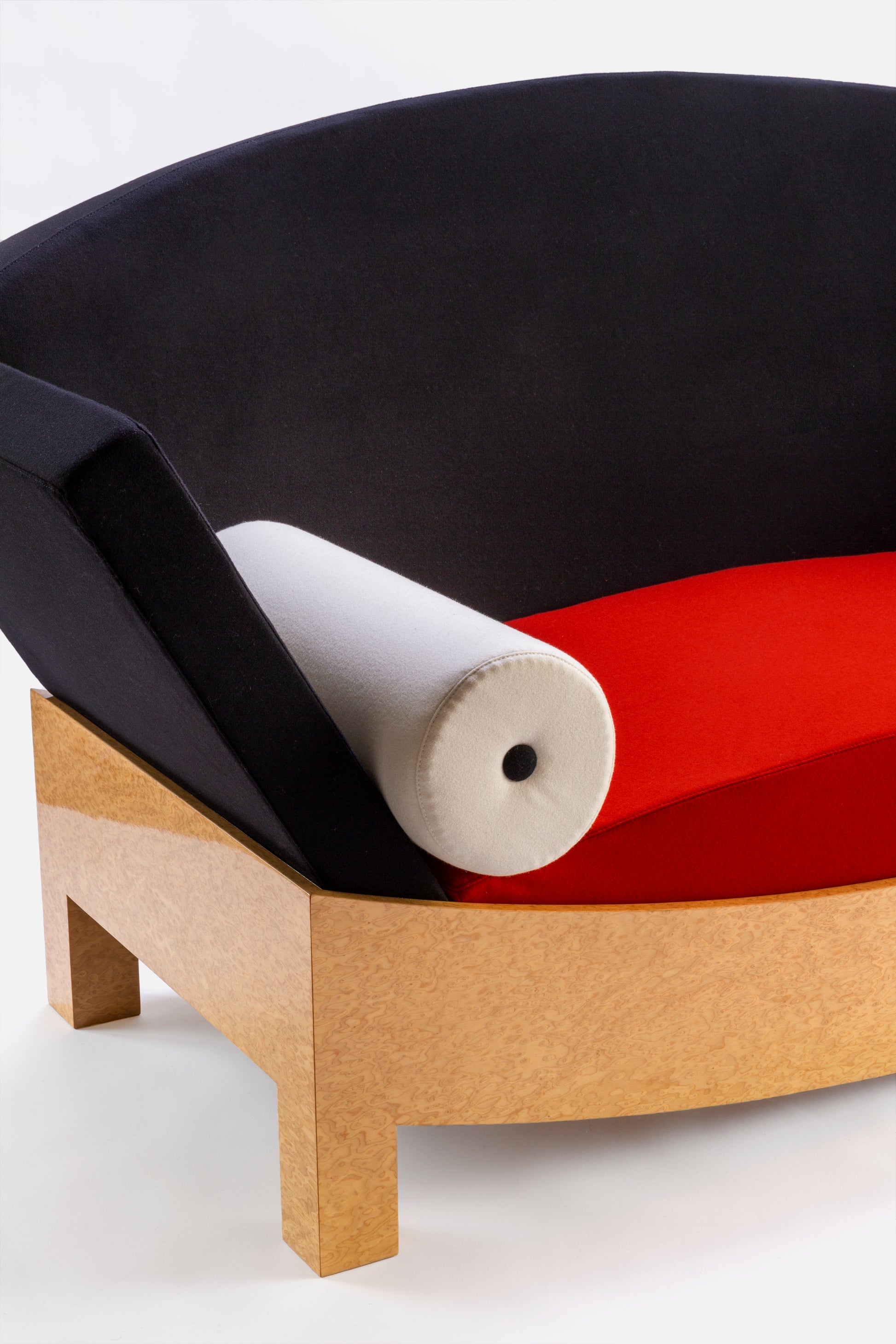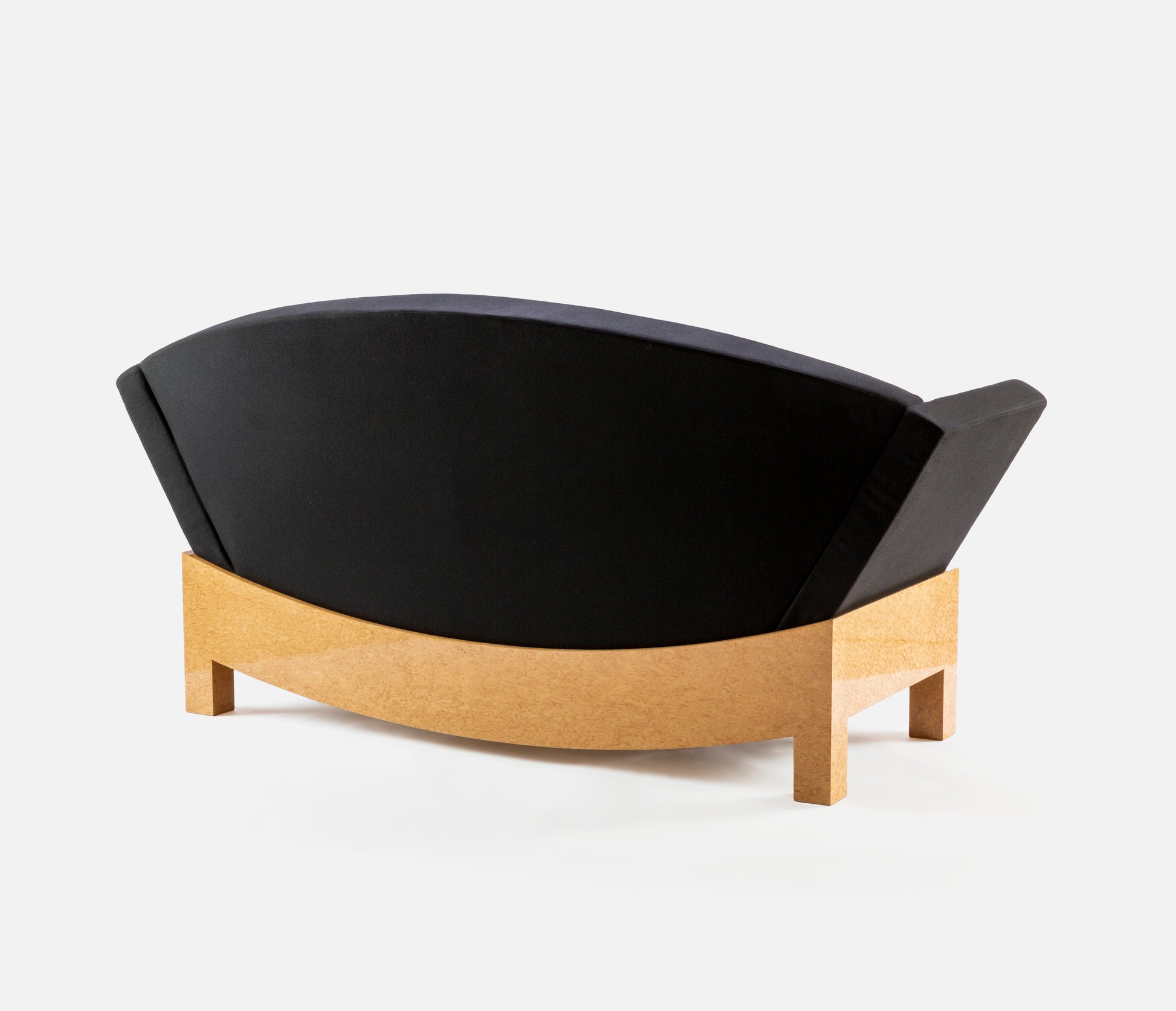 The Mitzi sofa — 1981, for Poltronova — part of the rich production of the Austrian master Hans Hollein, highlights a rigorous design while staging of a dialectic between different connotations and symbolisms. Soft and rigid elements are present together in the materials and forms. Upholstered cushions and soft wool cloth come alongside the walnut, both solid and in sheets, of the structure, and the curved line of the backrest coexists with the straight line at the base, masculine and feminine together: a sofa with a woman’s name.