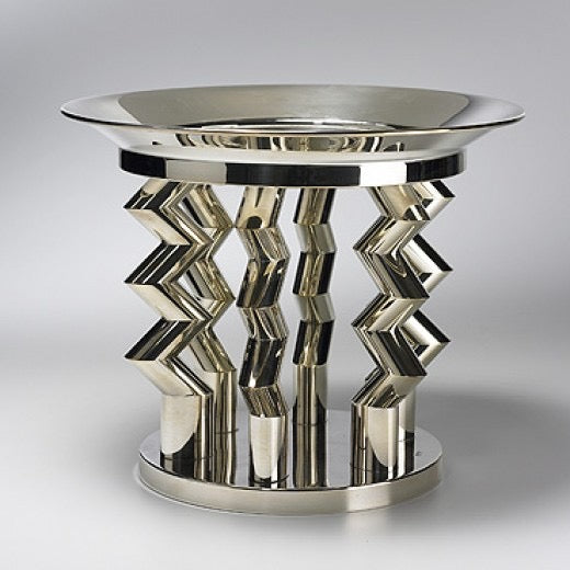 There is a removable "lid" of silver in the upper bowl, which hides the silver-coated screws that fasten the lightning-bolt legs, also impressed with “Memphis/Milano”.