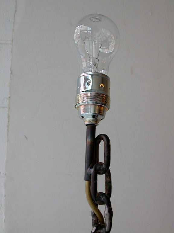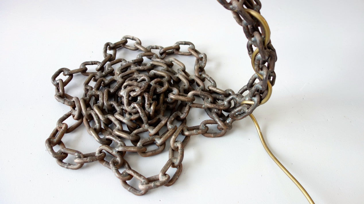 Welded iron chain floor lamp / metal lamp fabricated of welded iron chain, mild hoaring evident from welding process, otherwise blackened iron finish / light bulb and socket left raw & unadorned.