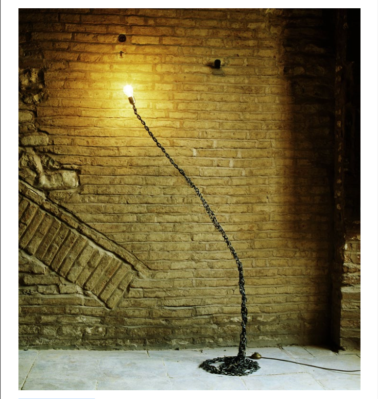 “Privat Lampe Des Kunstler II” floor lamp is an attempt to allow the art viewer/collector the opportunity to decorate their private residence with a rather strange yet wonderful Franz West metal object, fabricated of unwieldly-looking iron chain, absolutely austere in its appearance & solely embellished with a disquieting raw light bulb.