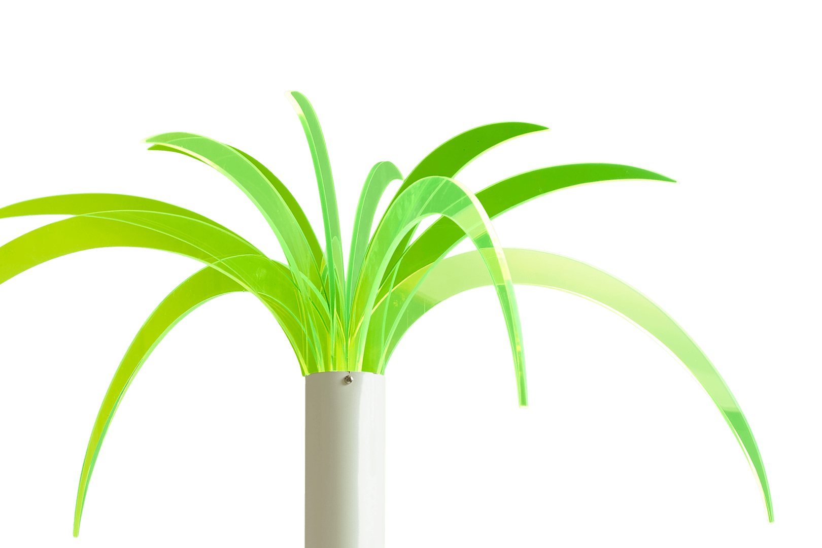 Painted sheet steel base and stem with laser-cut methacrylate pendants, halogen (50 watt) /