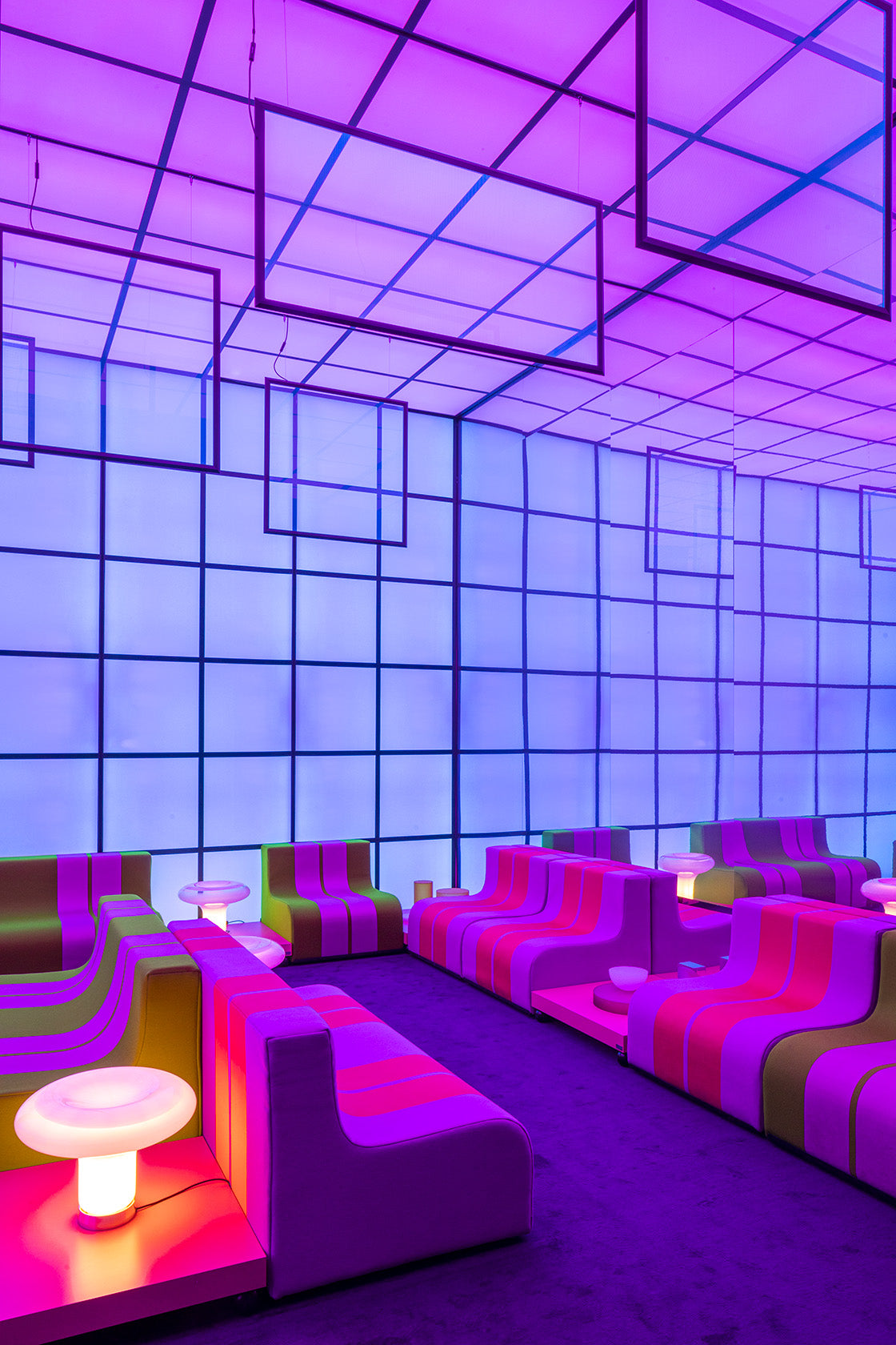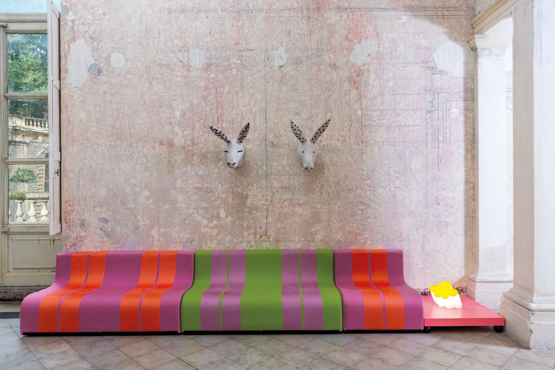 Sofo is a seat to place in a row, like a train, or to stack to build solid, colorful mountains. It is simply a block made with an S-shaped cut from a cube of polyurethane, covered with fabric featuring two large stripes. The result of a very simple operation, without wasted material or thought. It presents itself as a compact, abstract, colorful object that communicates the joy of living, like things that arrive from another world.
